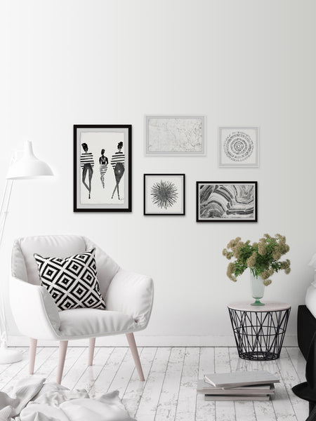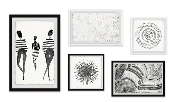 - Set includes (1) 16x24, (2) 18x12 and (2) 12x12 framed prints