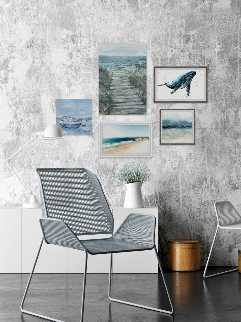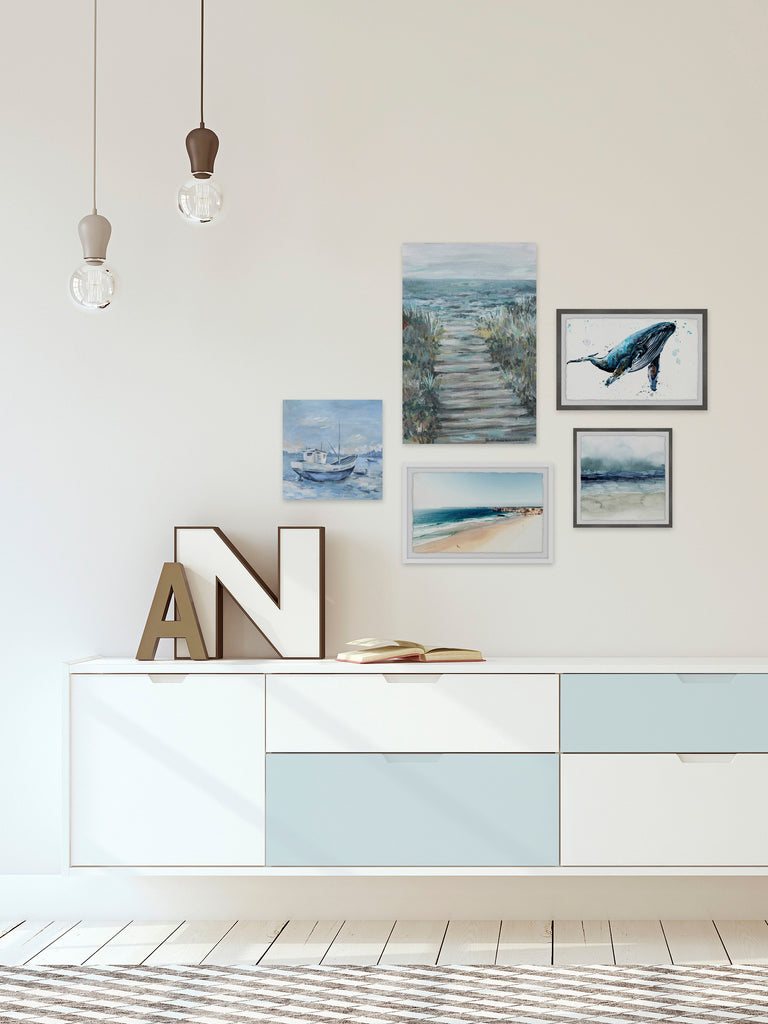 - Set includes (2) 18x12 and (1) 12x12 framed prints, and (1) 12x12 and (1) 16x24 canvas