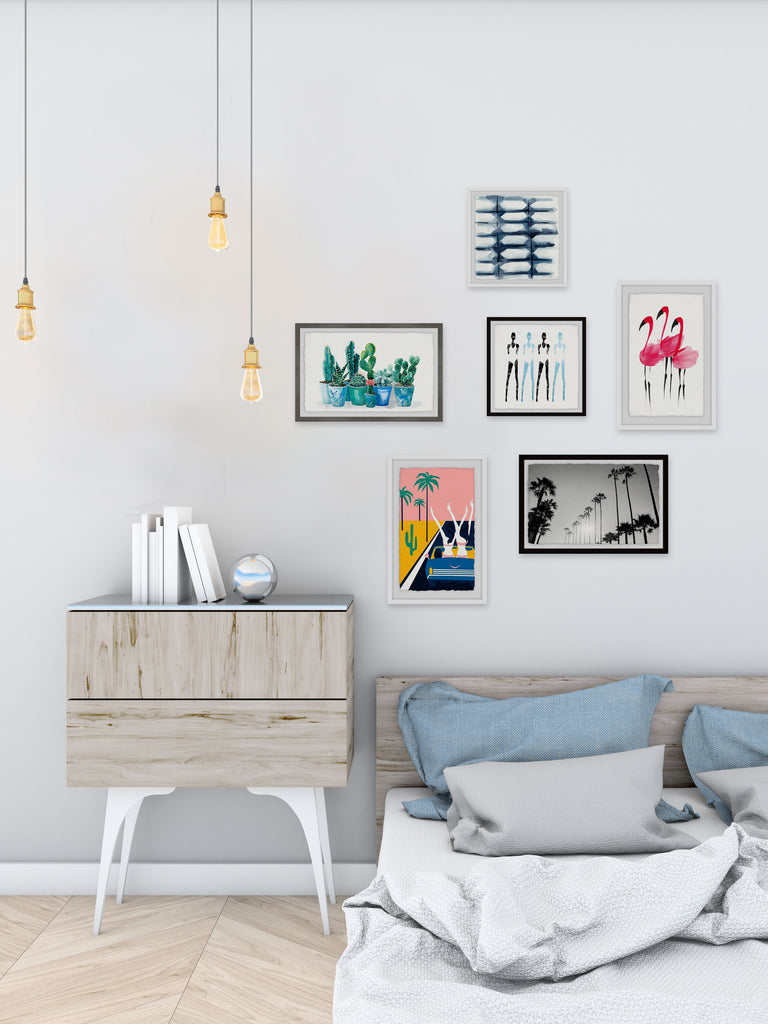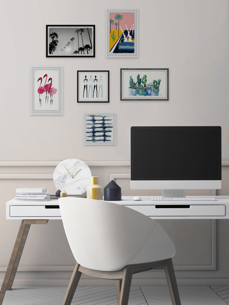 - Set includes (2) 12x12, (2) 18x12 and (2) 12x18 framed prints