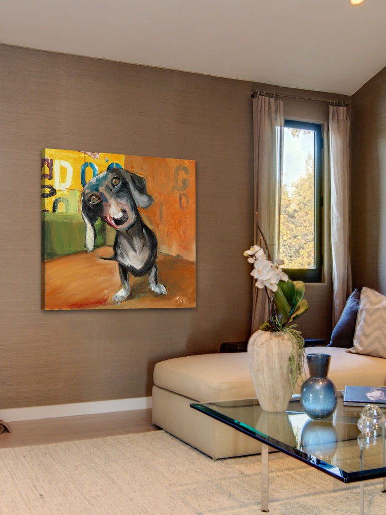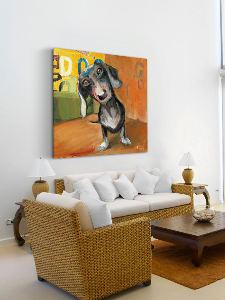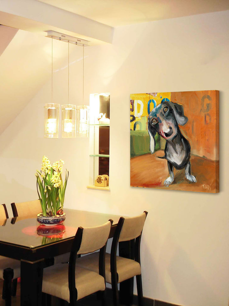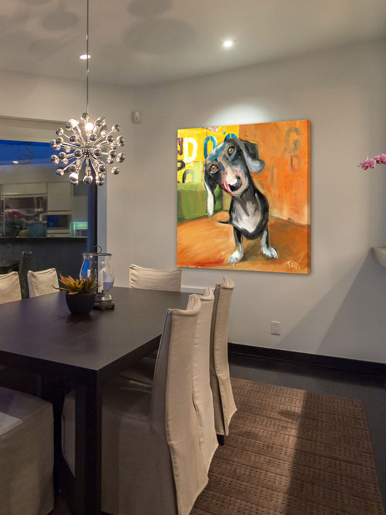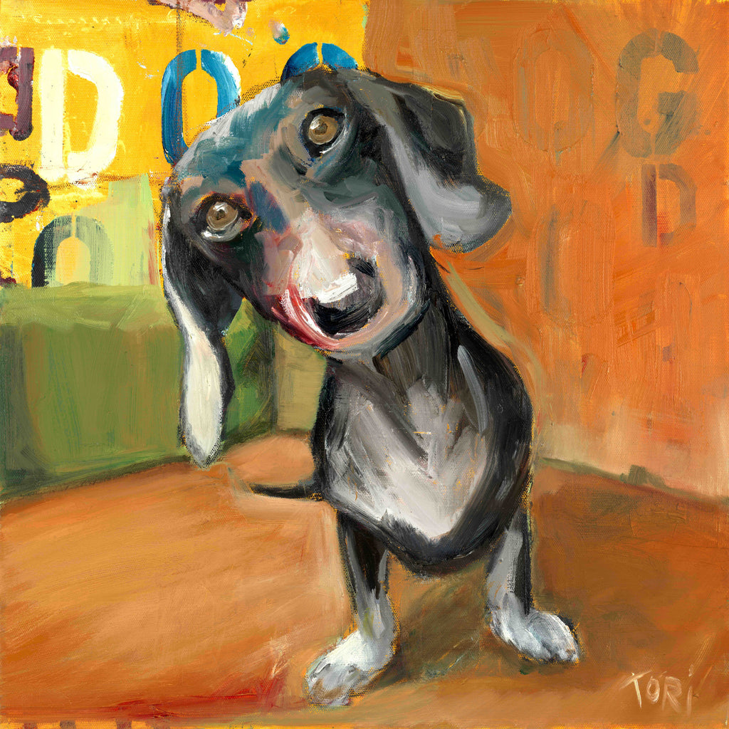 Tori Campisi artwork features dogs, patterns and other compositions exploding with optimism, color and "happy." In her words, "Ultimately, I want people to look at my art and smile, to find one part of their life within my painting that they, too, could relate to. I want my art to have a point of contact."
