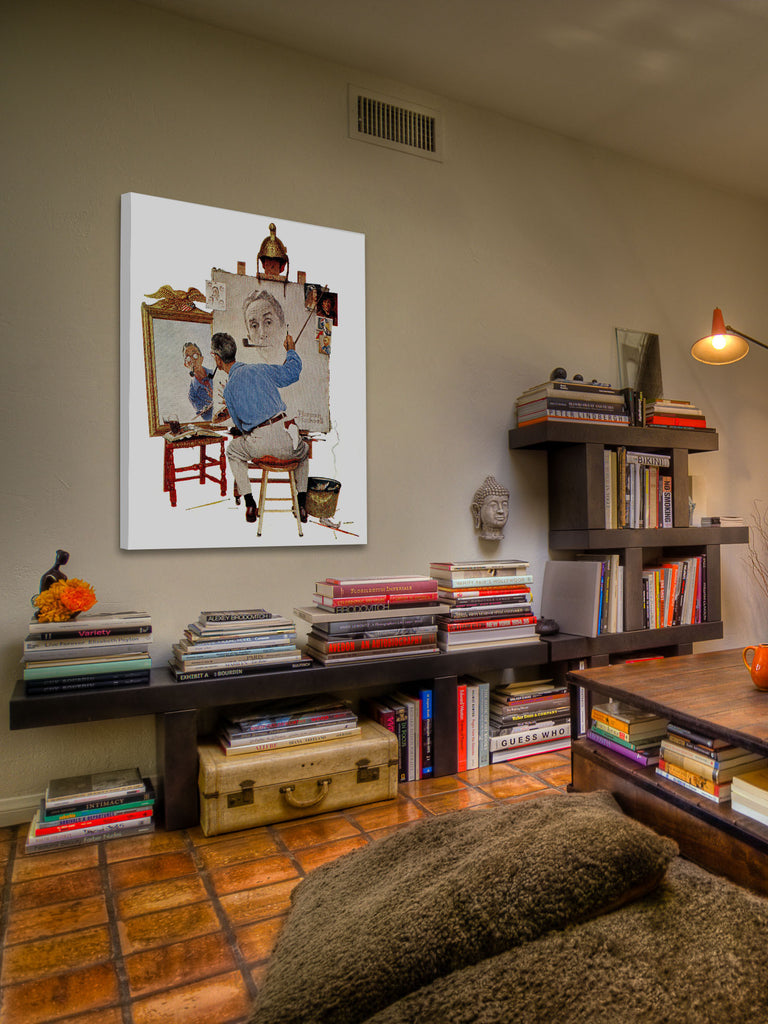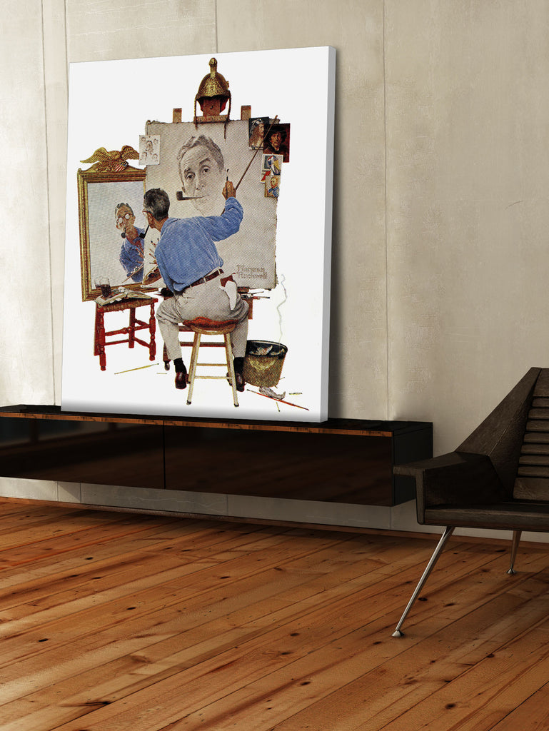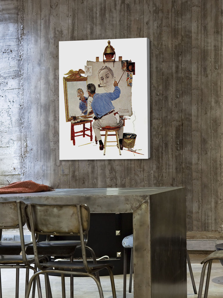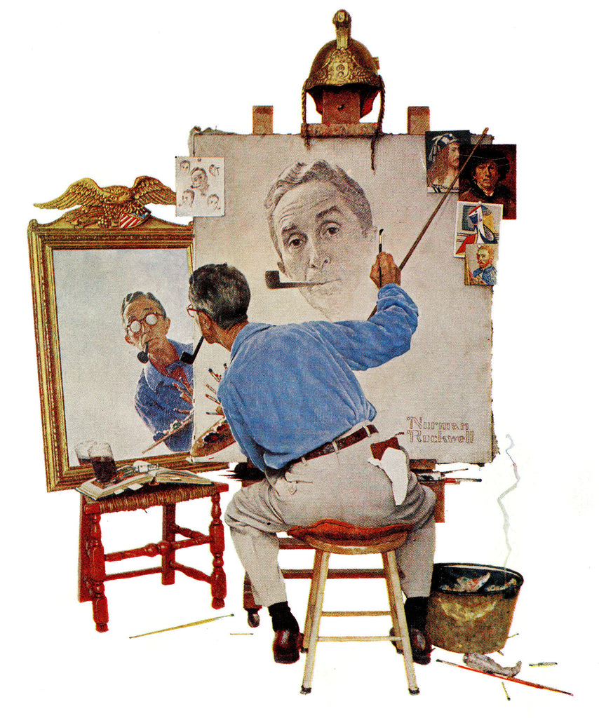 One of Rockwell's later paintings, Triple Self Portrait, appeared on the cover of The Saturday Evening Post on February 13th, 1960. Rockwell's sense of humor shines through in this painting. The humor is found in the small details such as Rockwell painting himself with foggy gasses. Rockwell was asked why he did this, his reply was,so I couldnŽt actually see what I looked like a homely, lanky fellow and therefore, I could stretch the truth just a bit and paint myself looking more suave and debonair than I actually am.
